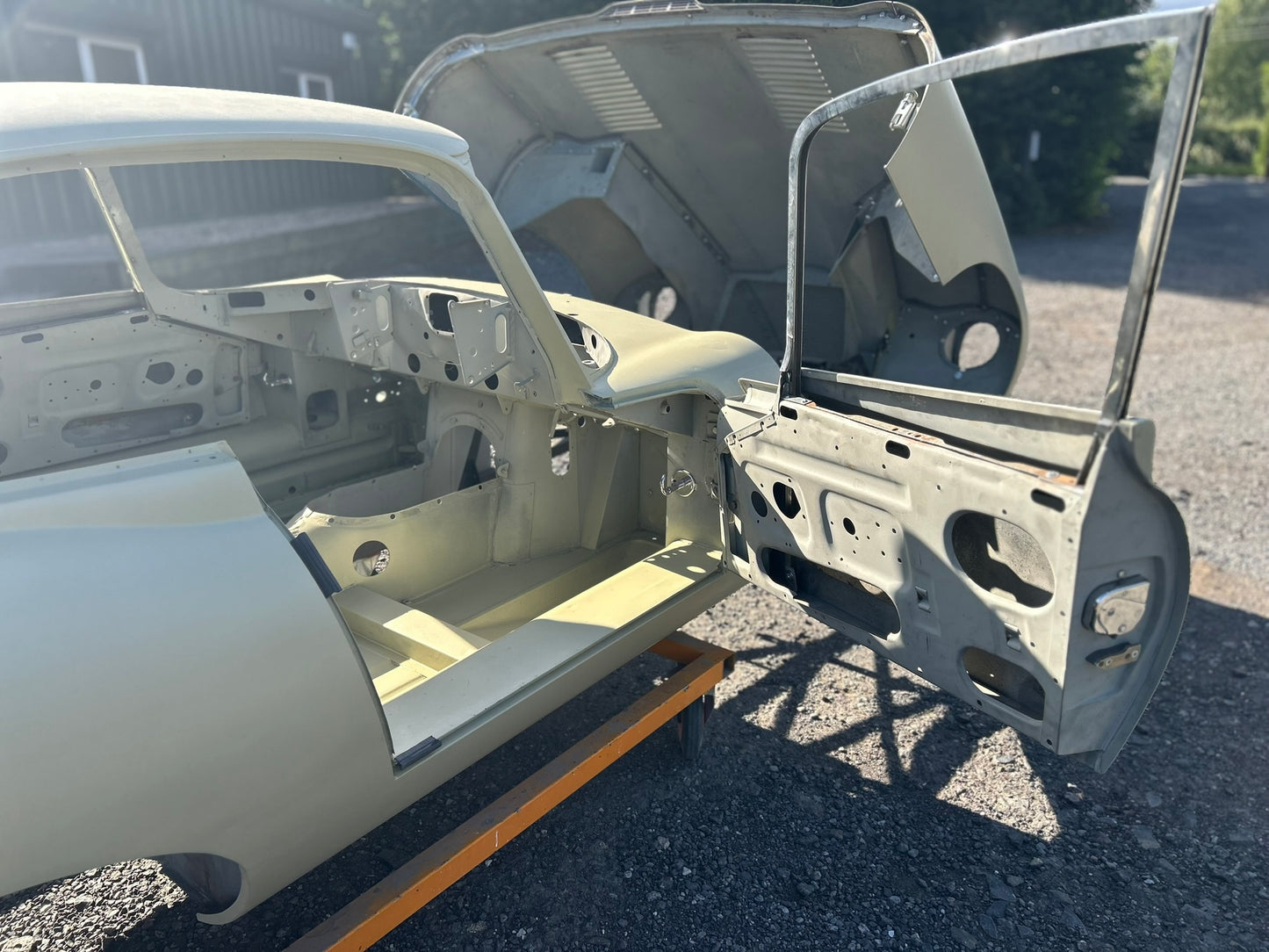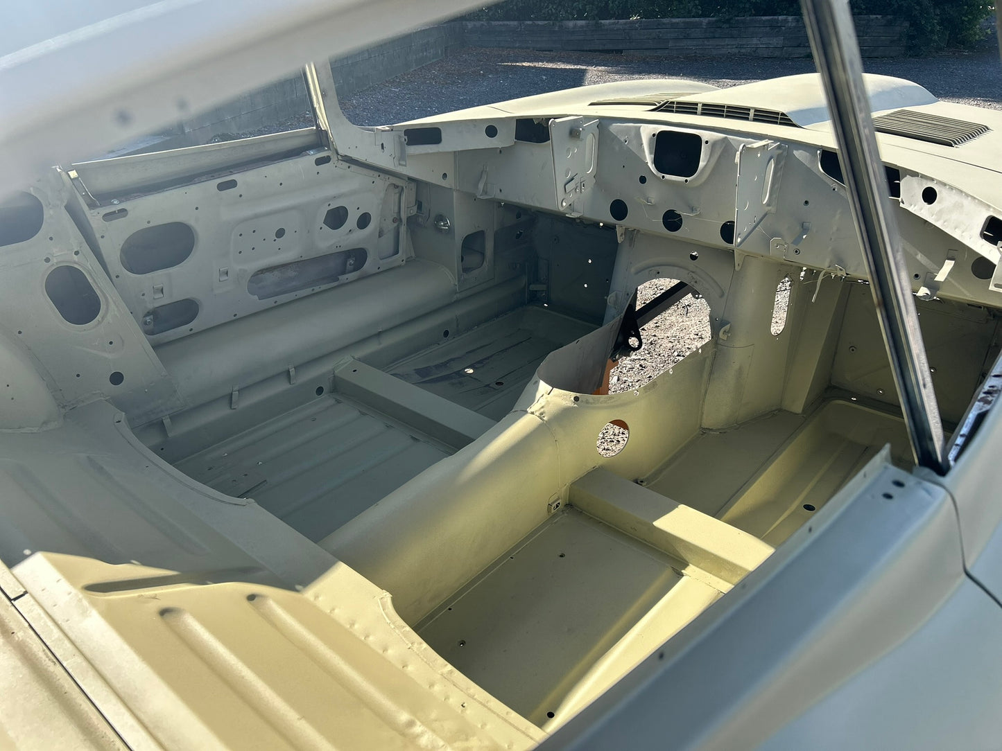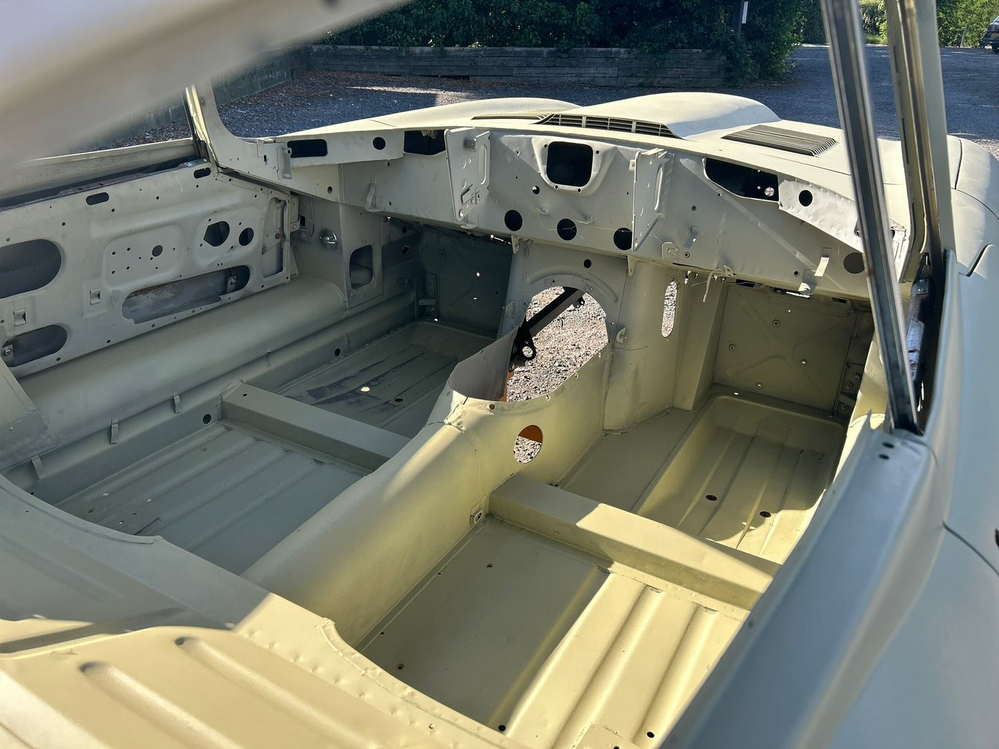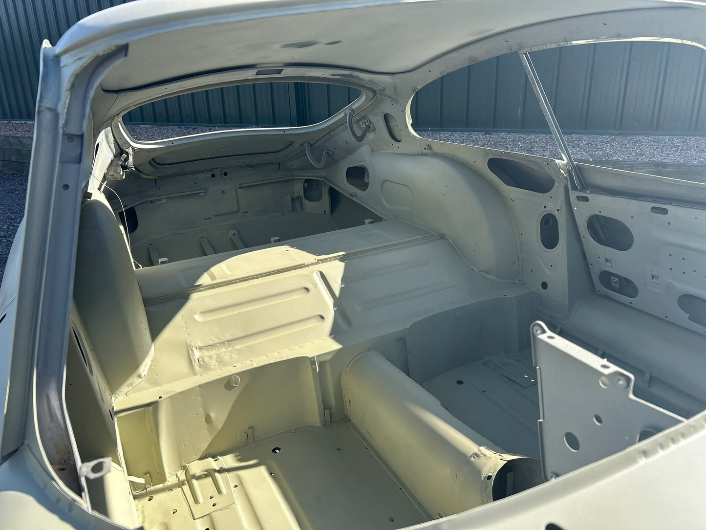 The body has been shot blasted, new outer sills fitted, yellow acid etched, gapped, profiled and ready for paint.