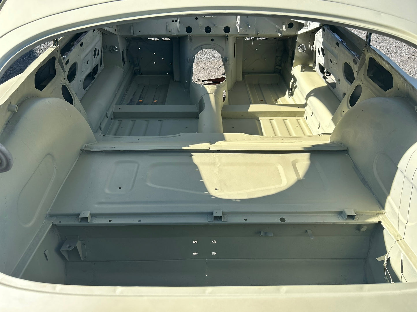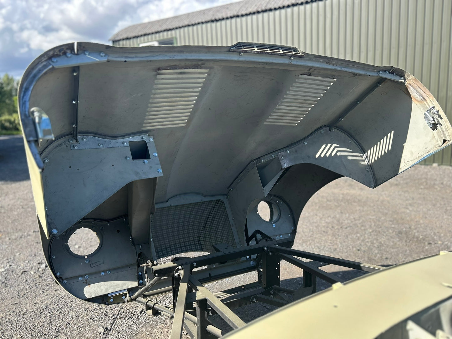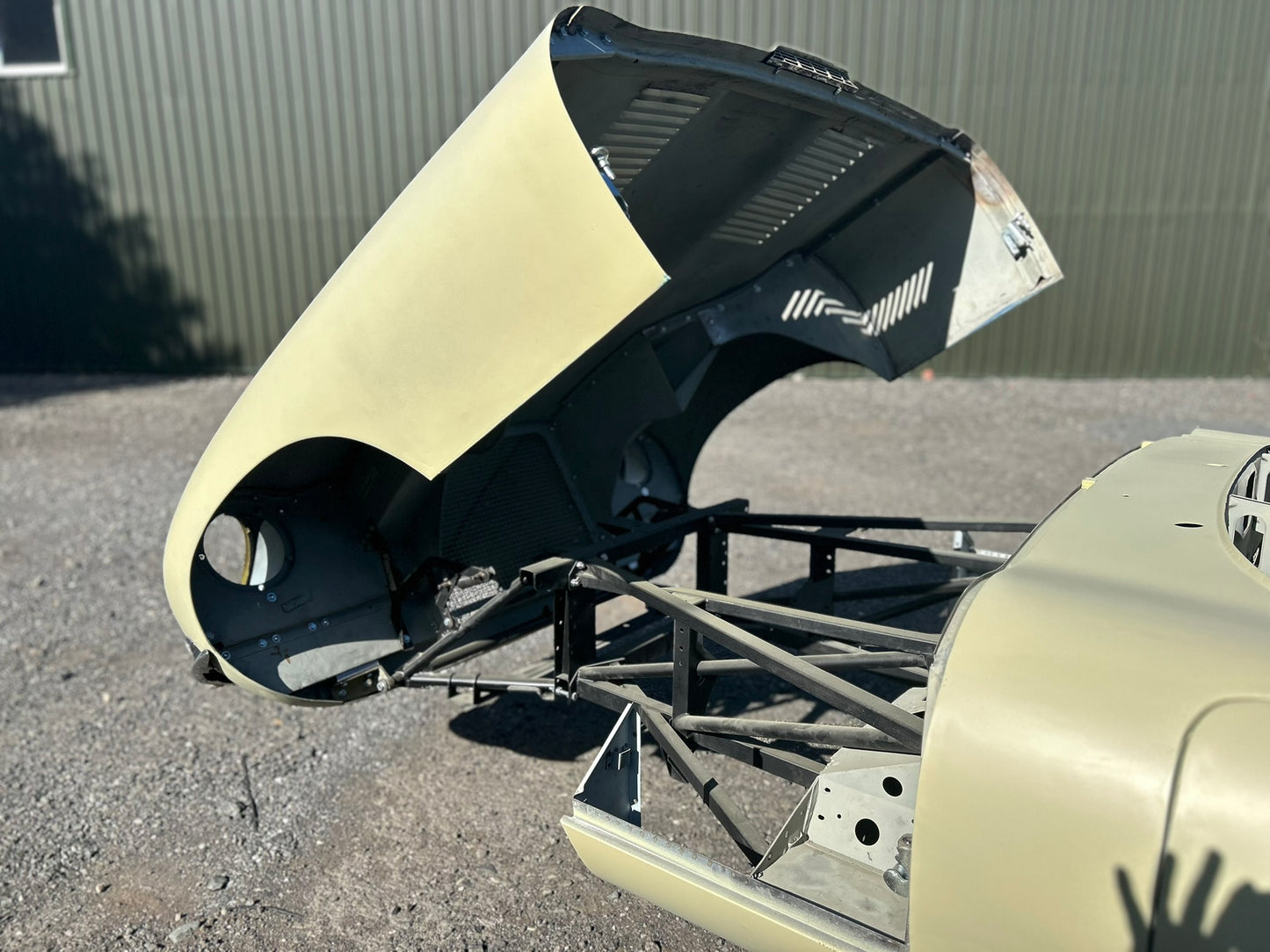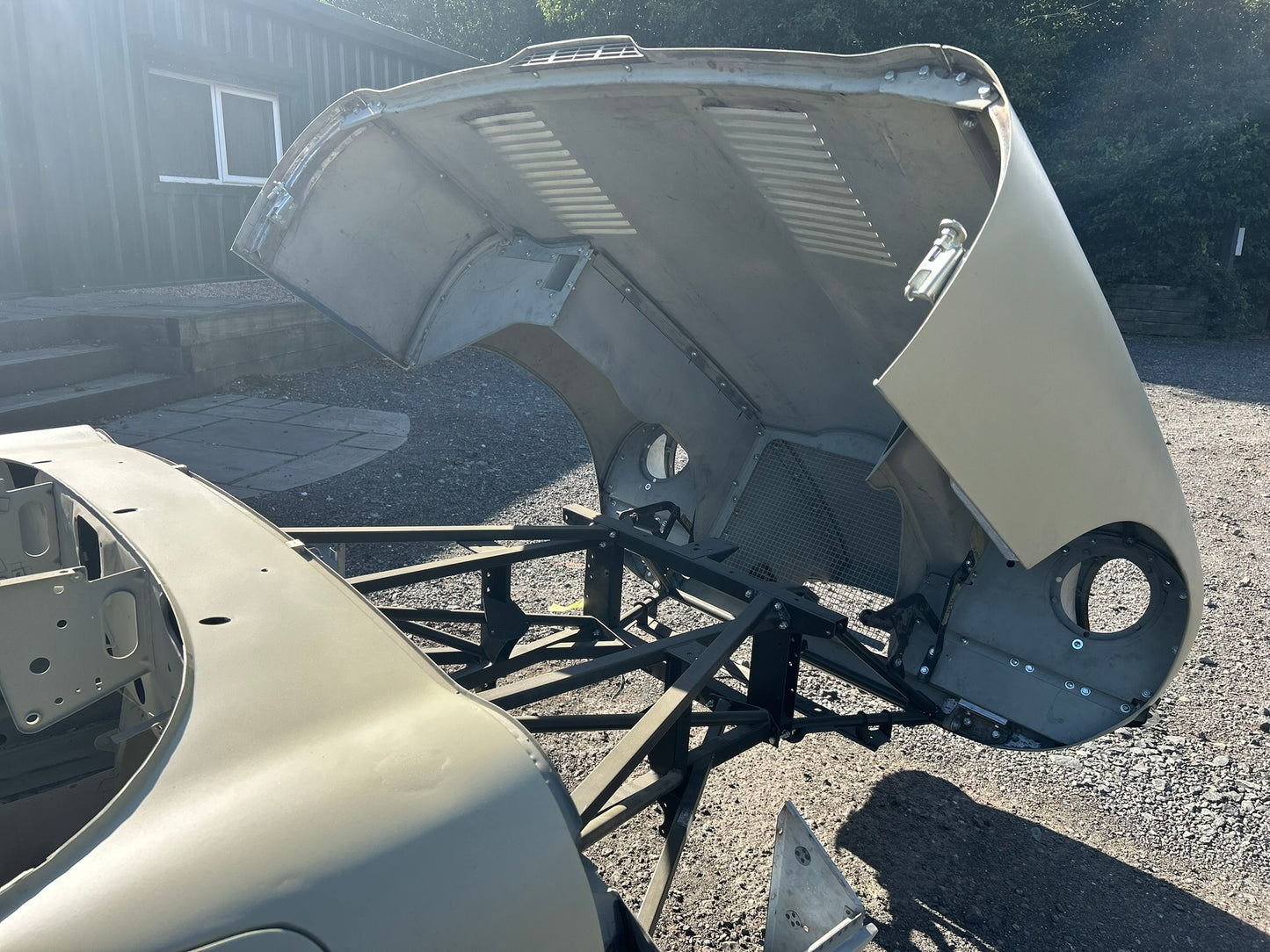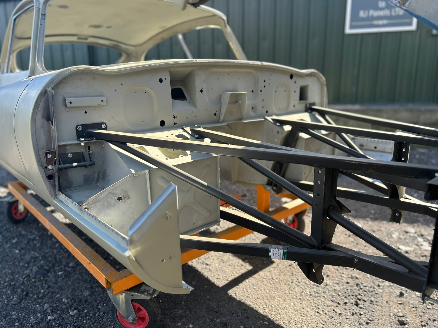 The body has been shot blasted, new outer sills fitted, yellow acid etched, gapped, profiled and ready for paint.